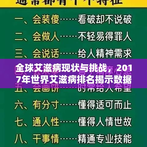 随着全球公共卫生事业的发展,艾滋病防治工作一直是国际社会关注的焦点,2017年世界艾滋排名揭示了全球艾滋病疫情的现状及挑战,本文将围绕这一主题,探讨全球艾滋病防治工作的进展与不足。